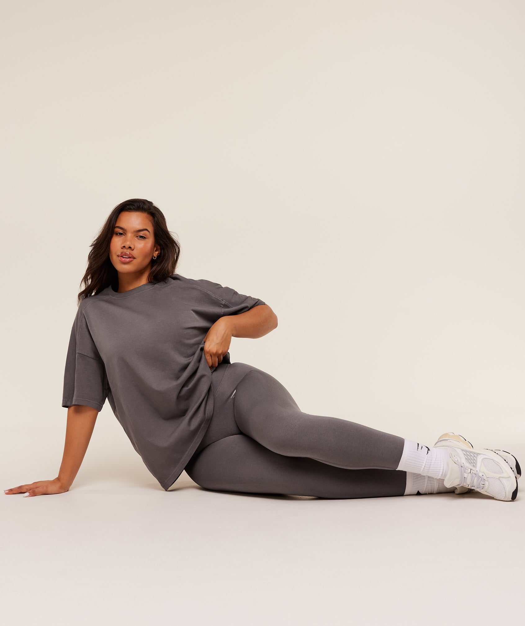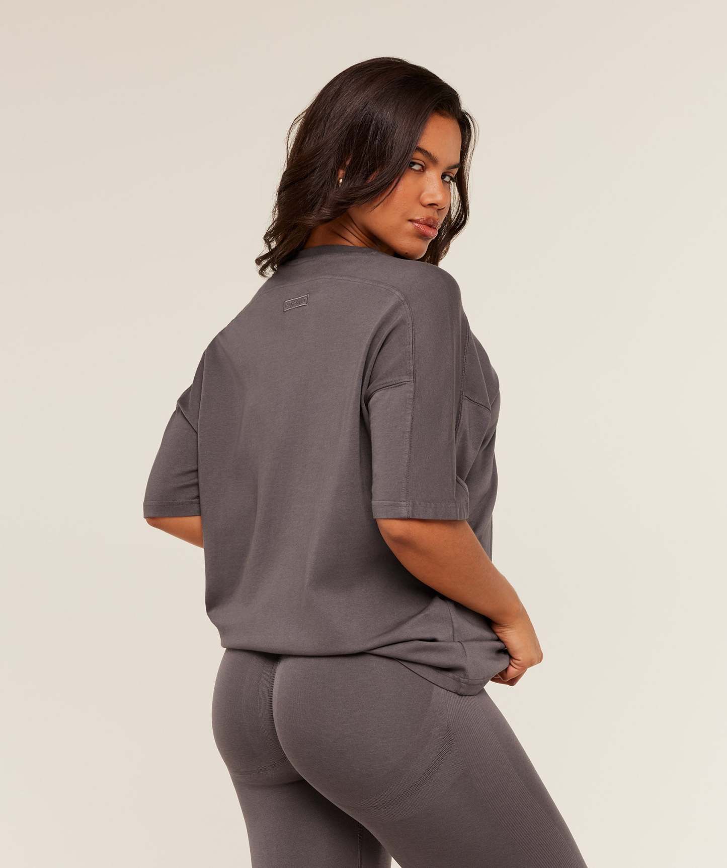 - Perfectly oversized to layer over your sports bra, leggings & shorts until you’ve built up a pump